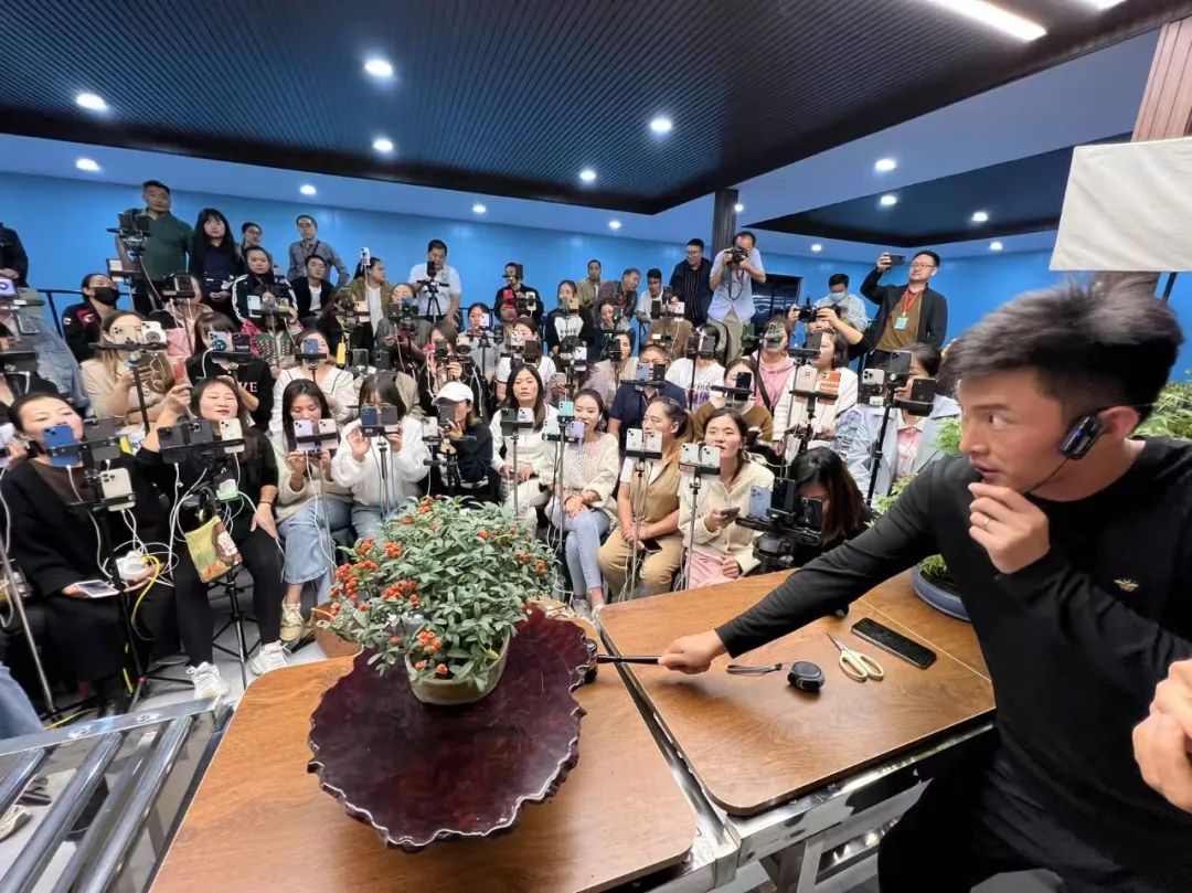 目前,线上购物以成为年轻人的首选,直播平台购物更甚。图为江苏宿迁市沭阳一花卉盆景基地盆栽拍卖直播现场。中国城市报记者全亚军 摄
